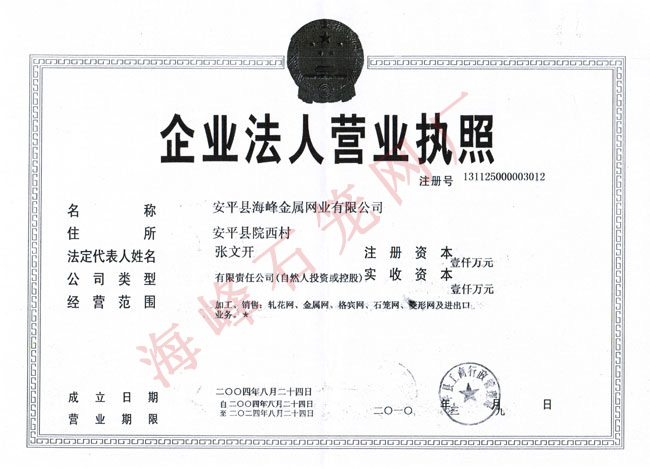 安平縣海峰金屬網(wǎng)業(yè)有限公司 安平縣海峰金屬網(wǎng)業(yè)有限公司位于中國著名的“絲網(wǎng)之鄉(xiāng)”——河北省安平縣,是具有拉絲織網(wǎng)、焊接、剪裁、噴塑、浸塑成品等一整套生產(chǎn)工藝的專業(yè)化廠家。本公司經(jīng)過多年來的順勢發(fā)展,現(xiàn)已擁有廣闊的生產(chǎn)廠房和優(yōu)良的辦公環(huán)境,占地8500平方米,在廠職工100余人。擁有高深的技術(shù)人員,高端的生產(chǎn)設(shè)備,全自動的機械化生產(chǎn)流水線,站在了軋花網(wǎng)、石籠網(wǎng)同行業(yè)的頂端。